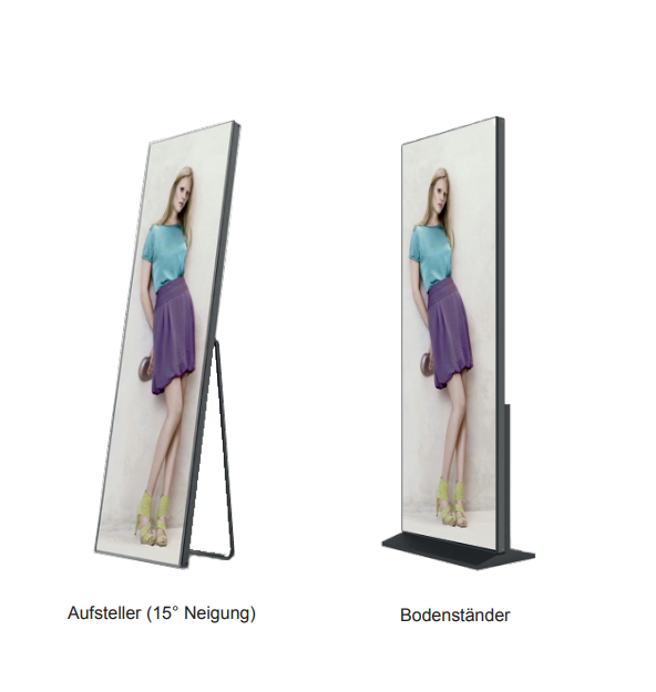 Mit einem Gewicht von nur 35 kg und einem besonders schlanken Format von 602x1970x40mm lässt sich das LED Poster mühelos transportieren und installieren. Die verschiedenen Montagemöglichkeiten erlauben eine individuelle Anpassung an räumliche Gegebenheiten – ideal für Messen, Events, Shops, Empfangsbereiche, Showrooms oder Konferenzräume.